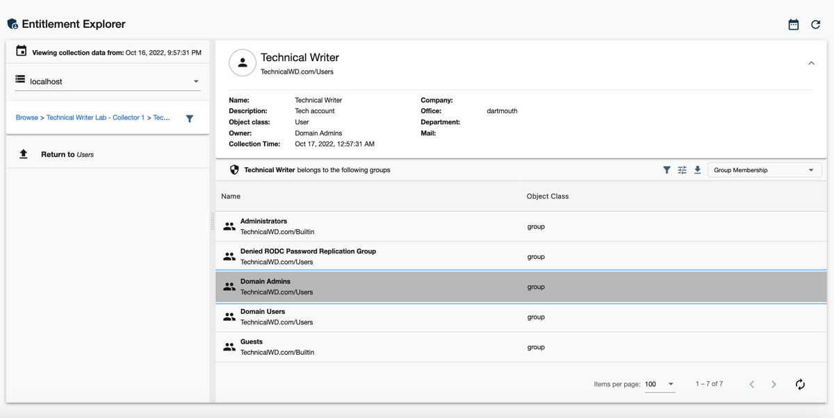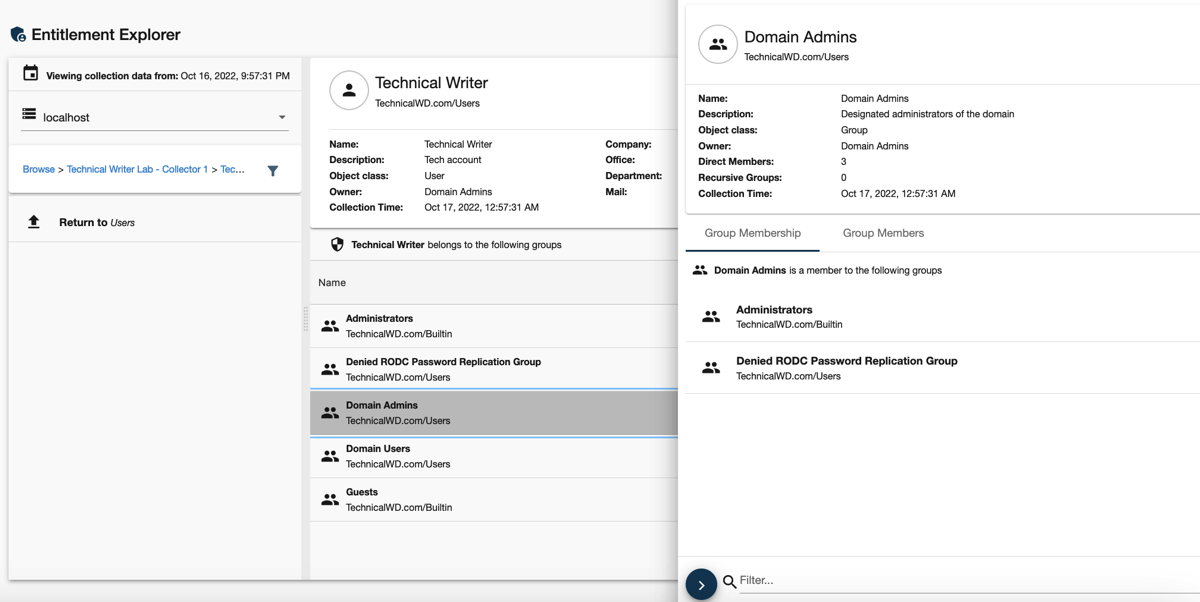 Leverage the Group Membership view to see the list of group where the object is a member. Check if the object was ever granted administrative permissions via group membership. Export the group list and save it as a PDF report for external auditors.