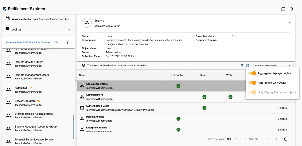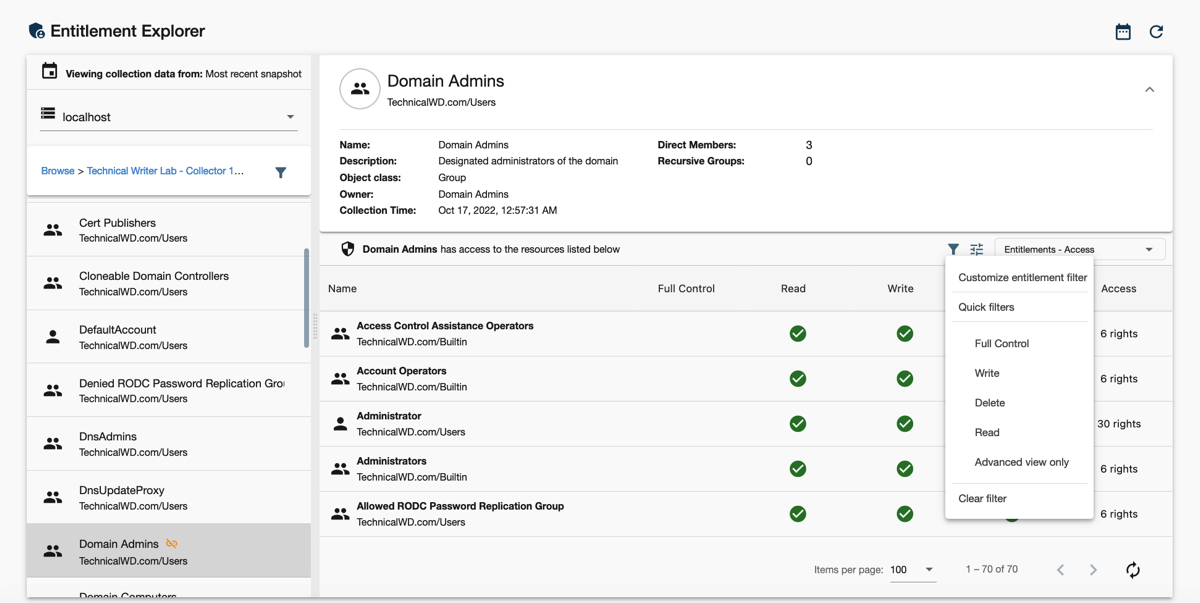 To narrow down the list of the entities in the bottom section, use filtering. You can either leverage a quick filter (e.g., full control) or create a custom filter and search for specific attributes.