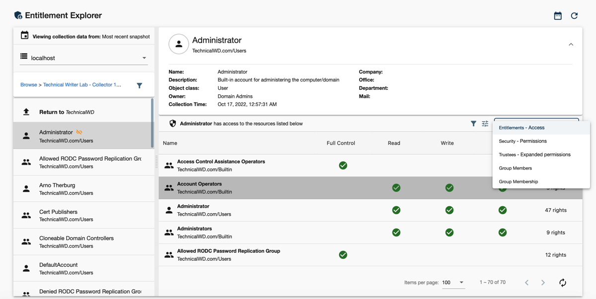 Once you locate an entity you are interested in, select it to see more details in the right-hand pane. While the top part displays general information such as the name, descriptions, class, and owner, the bottom section changes depending on the type of entitlement data you want to see for this particular object.